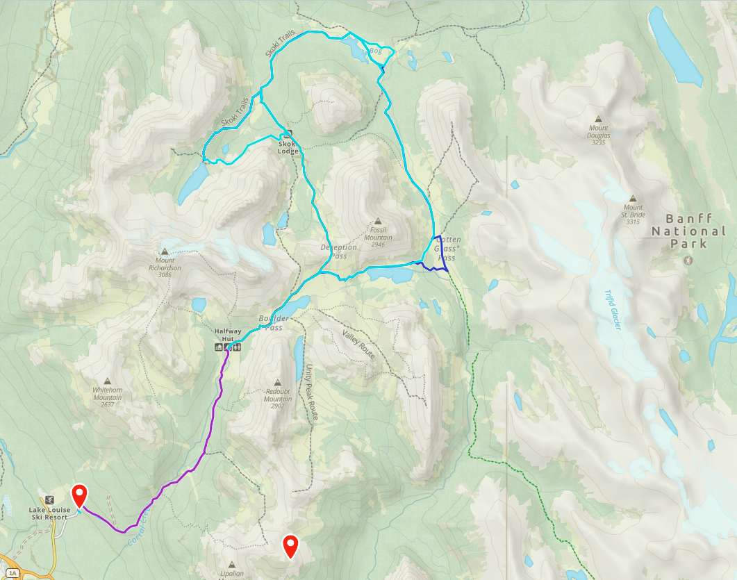 13 km - 150m gain, 650m loss Baker Creek - Skoki Loop Trailhead