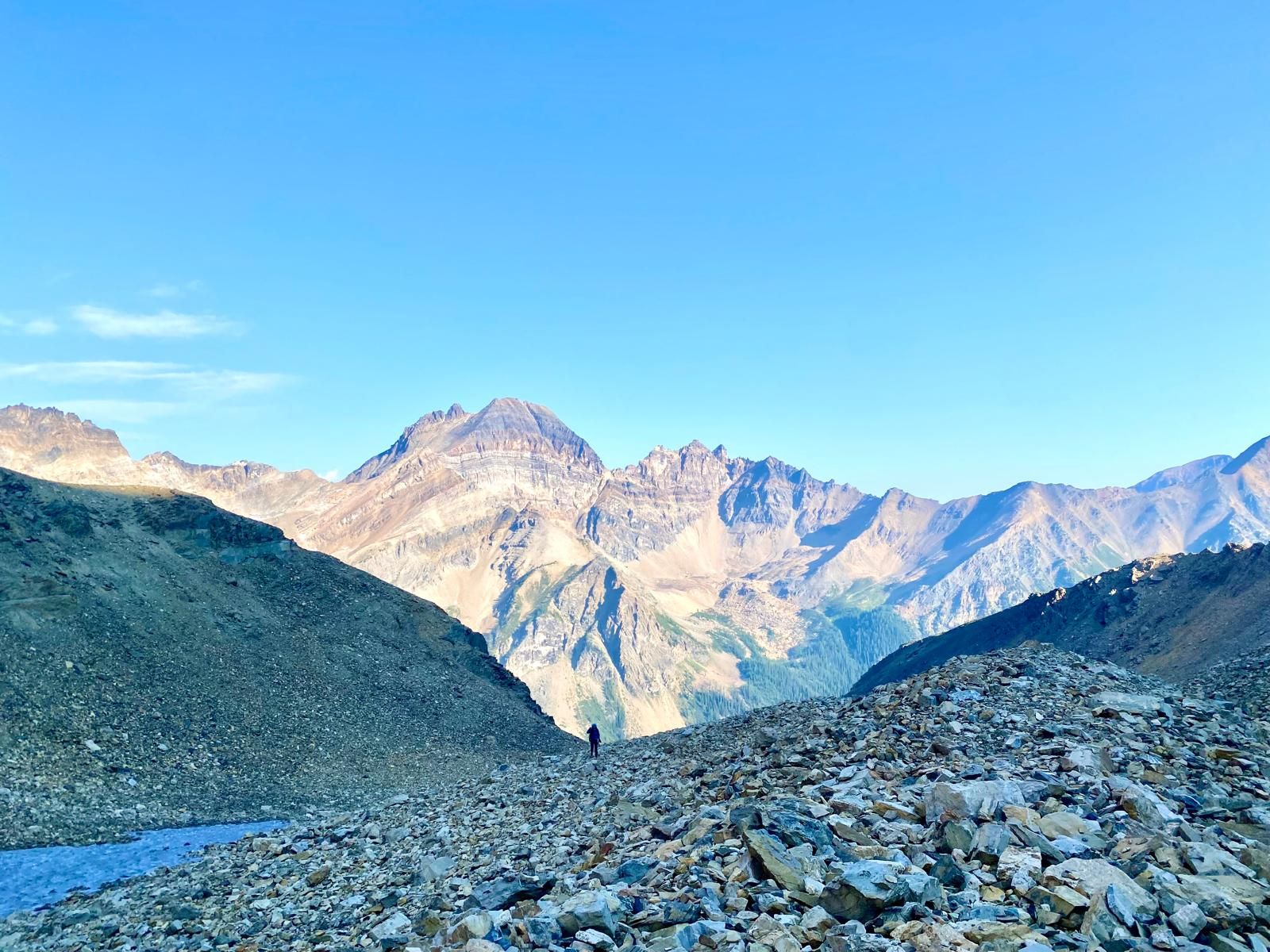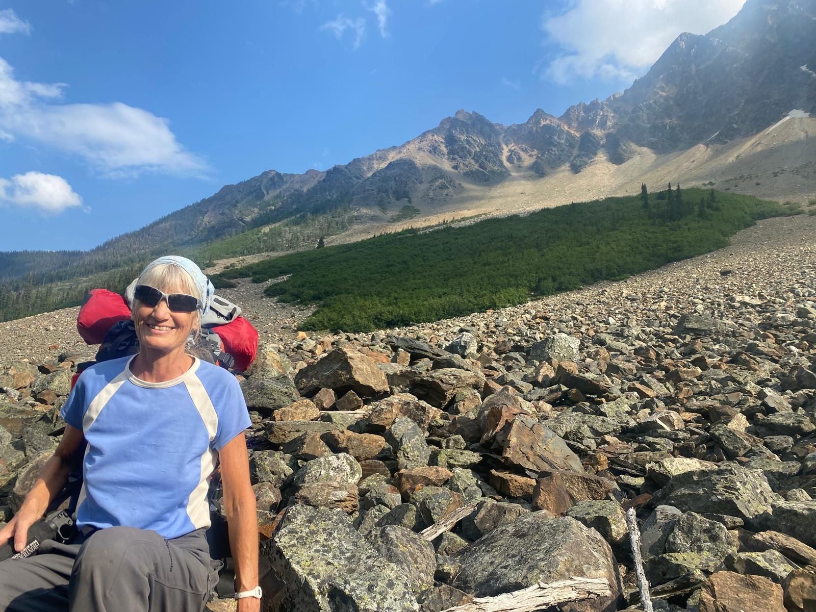 From here, we will start in a lush British Columbia forest and enter an open, vast valley with expansive views. Here, we will challenge ourselves to navigate the boulder fields; let us watch out footing and awe at the views of Mount Ethelbert.