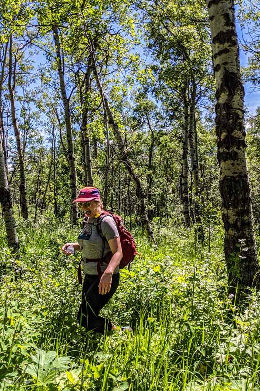 The trail started out steep, and stayed that way for most of our journey. Early on we saw a sign warning against touching any unfamiliar items or debris we might encounter. This is because Kananaskis Public Safety regularly uses explosives to perform avalanche control on the slopes above and it’s possible there could be unexploded ordnance. They advise that if you see anything like that: don’t touch it, take a picture, note the location, and let Kananaskis Public Safety know.