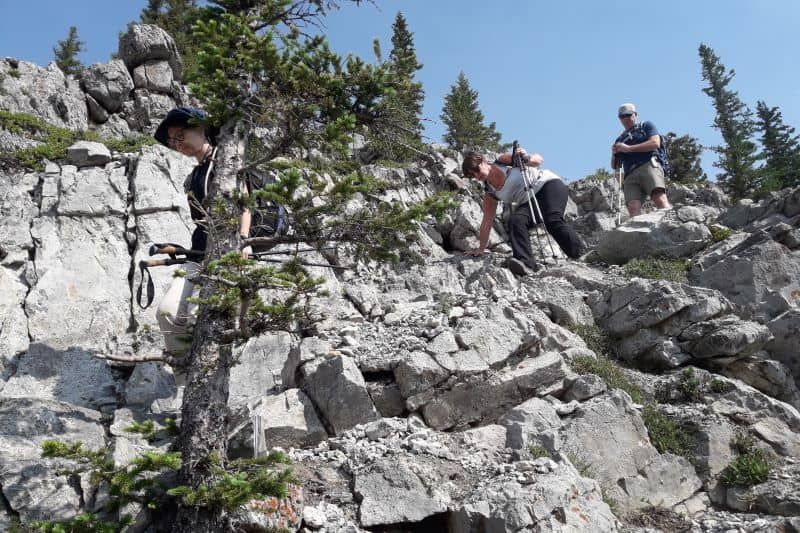 Speaking of rock climbing, there are many climbing routes that go up the cliff on the East face of Rundle, so we were careful to not knock rocks down off the ridge and onto others.