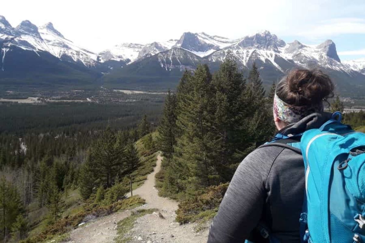 At the furthest east point of the loop, we broke out of the forest and were treated to some awesome views of the three sisters across the bow valley. This was the perfect place for an early lunch where we could really soak in the Mountain views. From here we had two options: loop back towards our starting point, or explore the trail above us (the Grotto Mountain Trail). We had a fair bit of energy and so elected to head upwards. We knew we weren’t going to go all the way up the Grotto trail (as that would have been well over 1000m more elevation gain) but we were curious what the trail was like and what the views might be. It was also good to check out in case we wanted to come back to Hike all the way up Grotto one day. We hiked up the Grotto trail for another 30 mins or, took in the views, and then headed back down to the Horseshoe loops.