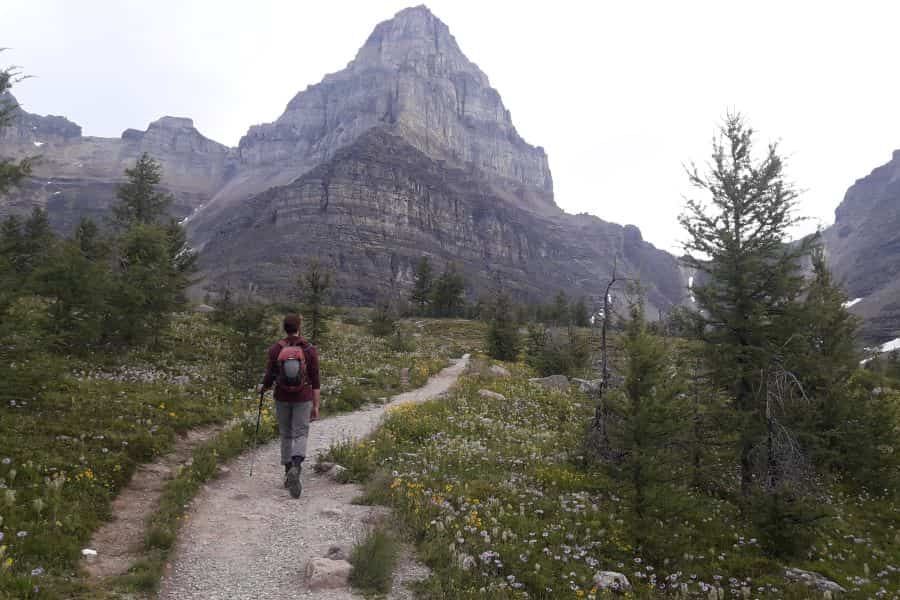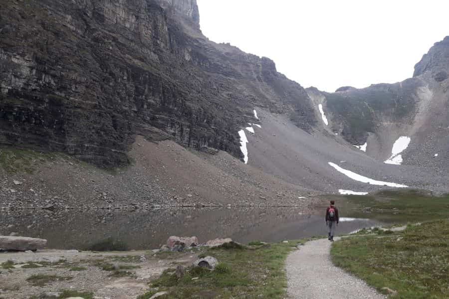 Beyond Minnestima Lakes there is a trail that continues on to Sentinel pass. That section of trail is considered difficult hiking since it mostly traverses steep scree slopes, and there is some rockfall hazard from above (a helmet can be a good idea). This section of trail often has lingering snowpatches where one can slip, and so is best for experienced hikers. The route up Temple after that is no longer a hike, and is a difficult scramble requiring experience and mountain skills.