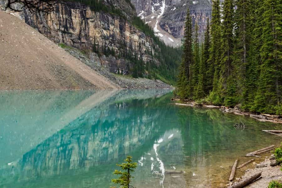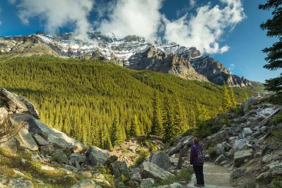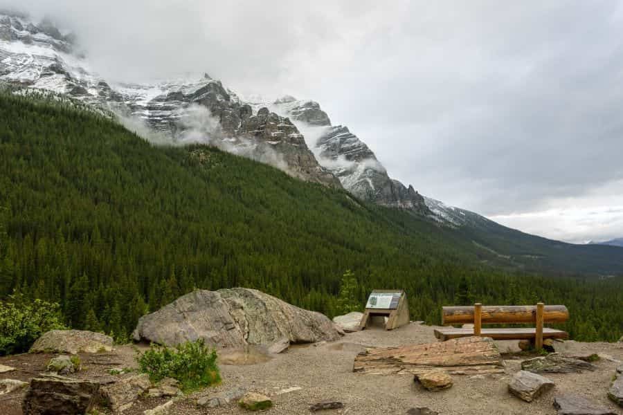 The moment we arrived at the parking lot, it became obvious why so many people want to visit this place. Mount Temple looms above, and we could see the lake peeking through the trees. There is a big jumble of boulders at the North end of the lake. We found it worthwhile to spend some time exploring here, following an established trail up to the top. If you’re lucky, you might even see a pika! Pikas are a close cousin to the rabbit, only live at high elevations, and they make the cutest “meep!” sound whenever people come near. This is where all the classic Moraine Lake photos are taken, but don’t forget to look behind you as Mount Temple rises high from the valley floor.