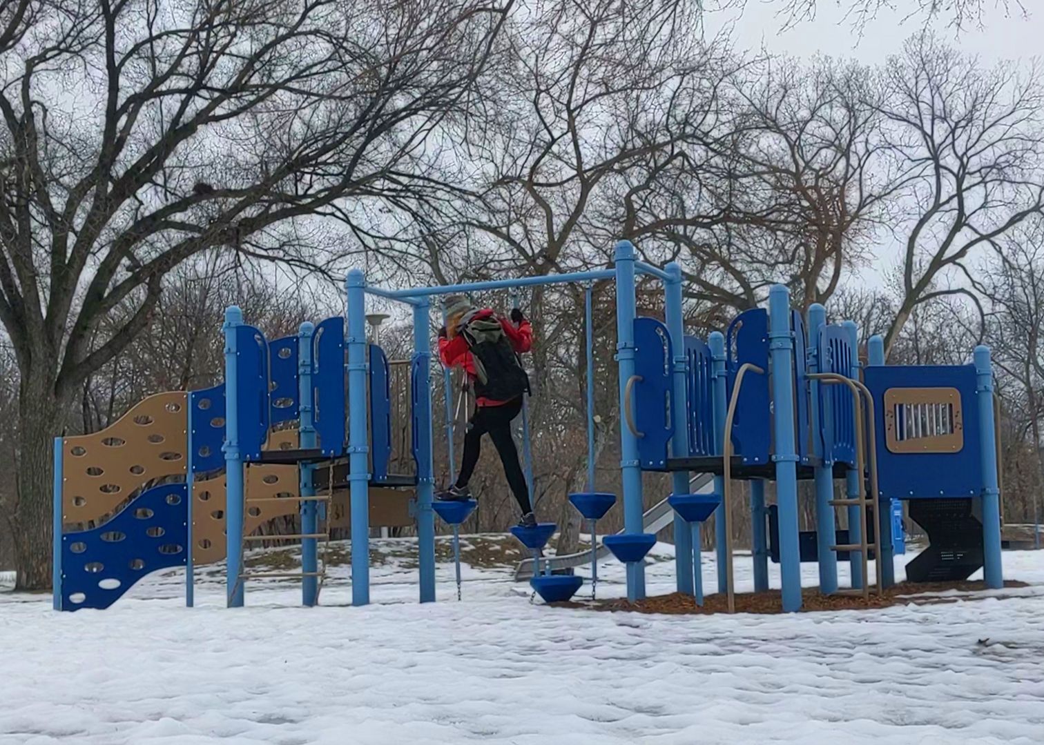 The author navigating the tenuous terrain of an urban play structure.