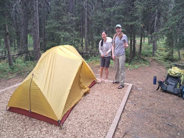 The hike was fun and the views amazing, but we were happy to arrive at camp! This site has been upgraded to the modern Banff National Park backcountry camping standard with level tent pads made of well draining wood chips, picnic tables, and easy to access bear lockers.