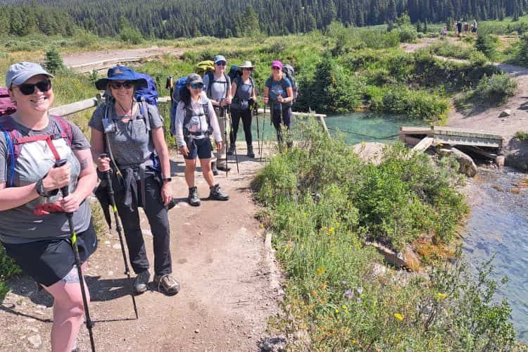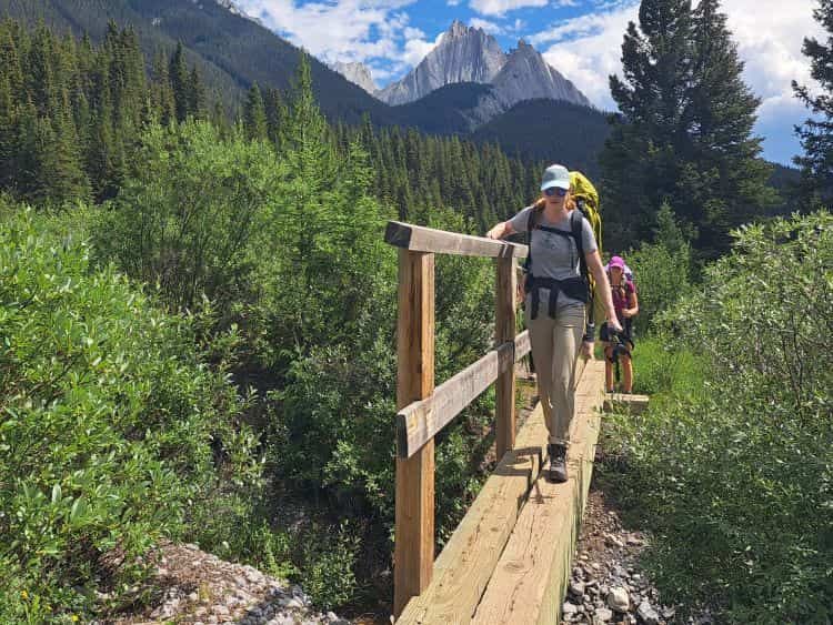 After the inkpots, we packed up our stuff and continued on up the valley. There were several bridges to navigate, the first was over the rushing Johnston Creek (which would flow down to become Johnston falls in the canyon), and others were over dry creek beds. We hiked this part of the trail at the end of July, so some of the bridges are meant to keep hikers out of the streams and mud in spring conditions. The valley offered lots of open views of Mount Ishbel with it’s striking limestone features and massive Mystic Peak. This was prime bear territory, so we were glad we were equipped with bear spray and the knowledge of how to travel in bear country. The wildflowers were gorgeous and in their full glory, and we stopped many times to admire them.