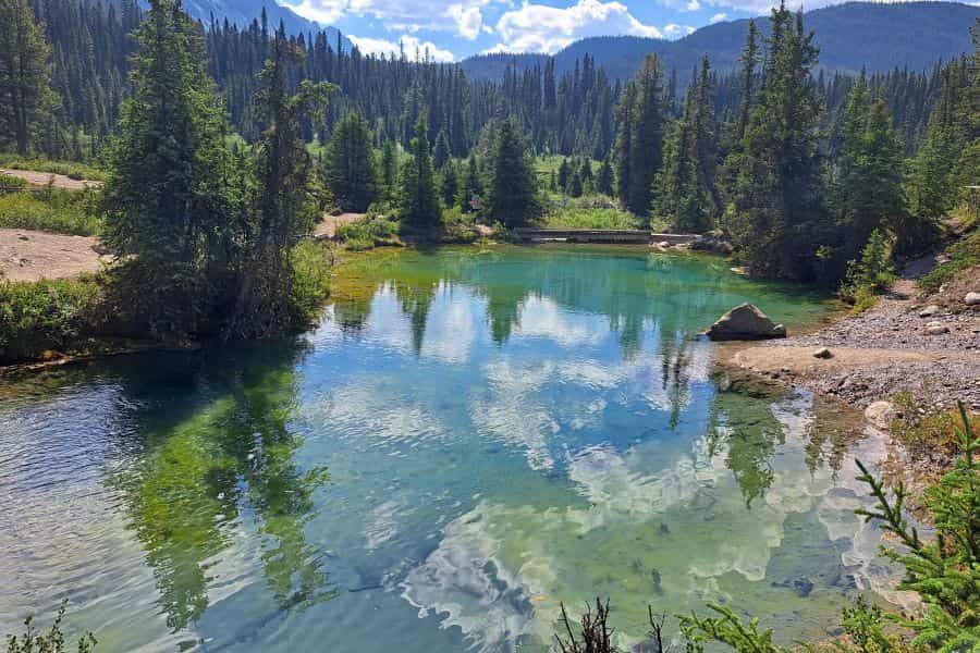 The Ink Pots are a series of small, interconnected ponds that are each a different and stunning colour ranging from blue, through aqumarine, to green. They are spring fed, and you can even see the water bubbling up through the sand at the bottom. Different ponds fill at different rates, so each pond has a different kind and size of minerals suspended in them. These different sized particles reflect light back in different ways, giving each pond its own hue.