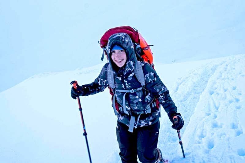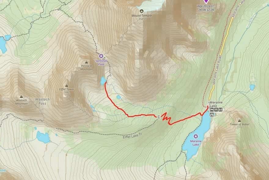 Beyond Minnestima Lakes there is a trail that continues on to Sentinel pass. That section of trail is considered difficult hiking since it mostly traverses steep scree slopes, and there is some rockfall hazard from above (a helmet can be a good idea). This section of trail often has lingering snowpatches where one can slip, and so is best for experienced hikers. The route up Temple after that is no longer a hike, and is a difficult scramble requiring experience and mountain skills.